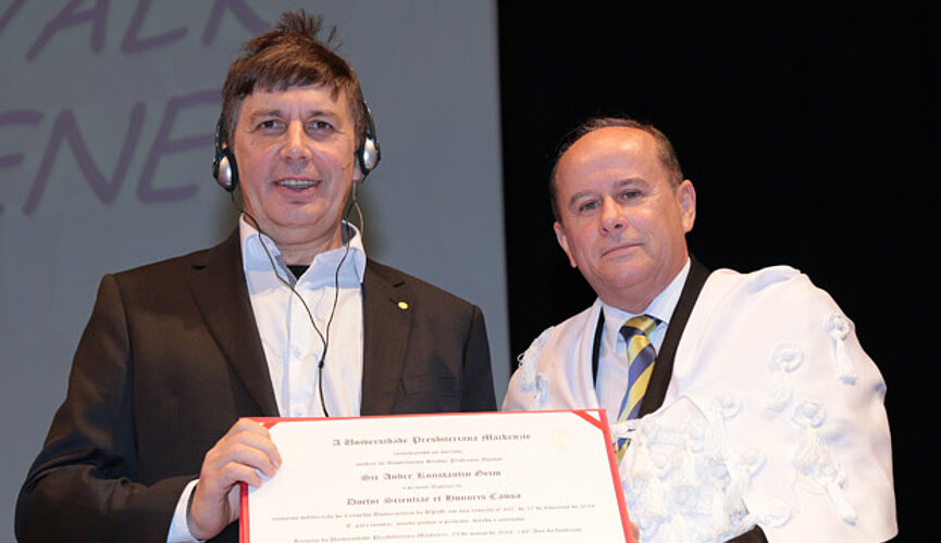 A mesa foi composta pelo vice-presidente do Supremo Concílio da Igreja Presbiteriana do Brasil (IPB), reverendo doutor Augustus Nicodemus Gomes Lopes; o reitor da Universidade Presbiteriana Mackenzie (UPM),doutor Benedito Guimarães Aguiar Neto; o presidente do Conselho de Curadores do Instituto Presbiteriano Mackenzie (IPM),reverendo Juarez Marcondes Filho; o presidente do Conselho Deliberativo do IPM,conselheiro José Inácio Ramos; o presidente do IPM, entidade mantenedora da UPM, engenheiroMaurício Melo de Meneses; o vice-reitor da UPM, doutor Marco Tullio de Castro Vasconcelos; os pró-reitores da UPM, doutor Cleverson Pereira de Almeida, pró-reitor de Graduação e Assuntos Acadêmicos; doutora Helena Bonito, pró-reitora de Pesquisa e Pós-Graduação; doutor Sergio Lex,pró-reitor de Extensão e Educação Continuada; o reverendo Alderi Matos, chanceler em exercício da UPM, representando o chanceler reverendo David Charles Gomes; e pelo homenageado, Sir André Geim.