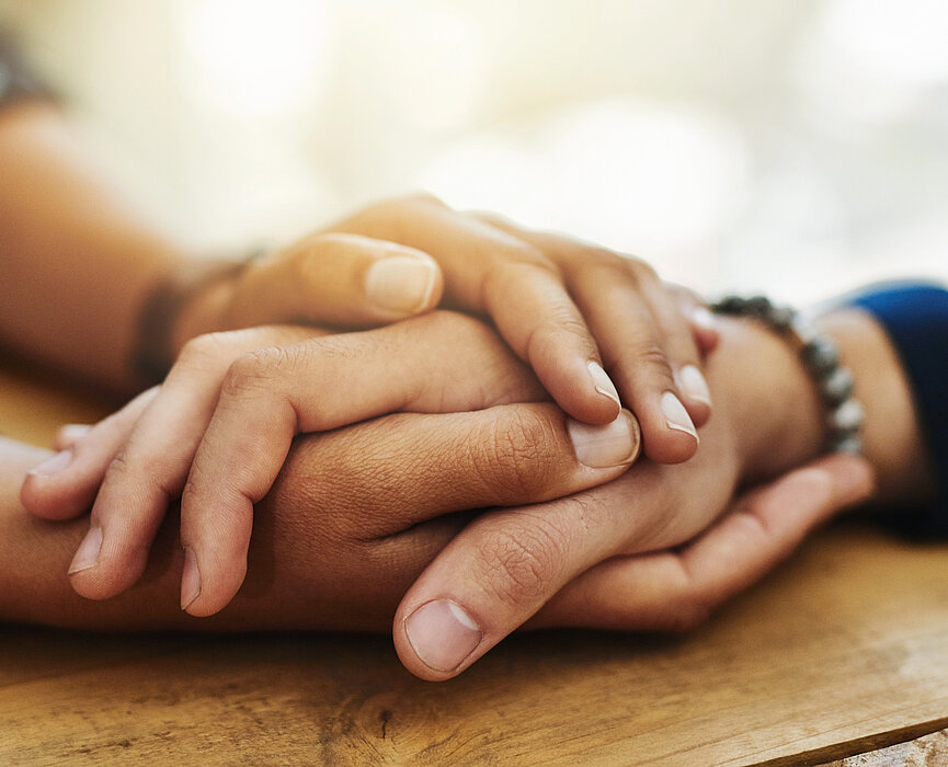 Duas pessoas segurando as mãos, apoiadas em uma mesa.