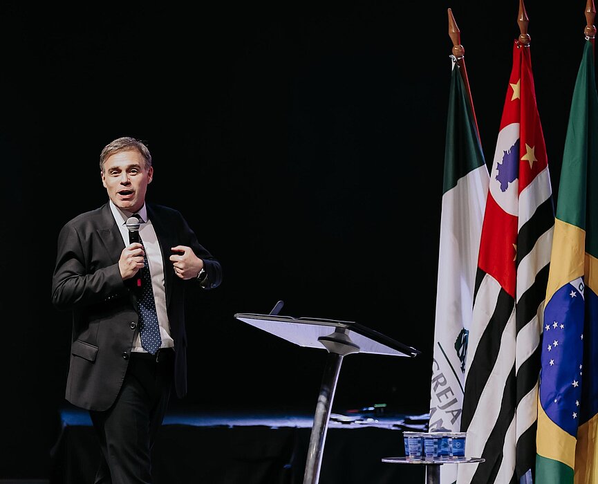 O reverendo José Roberto Rodrigues Coelho, capelão da Educação Básica do Colégio Presbiteriano Mackenzie (CPM), representando o chanceler do Mackenzie, Robinson Grangeiro Monteiro, realizou o momento devocional da noite.