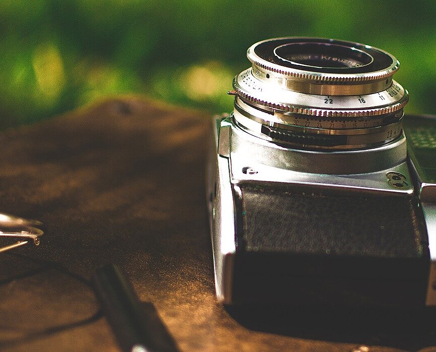 câmera fotográfica antiga sobre mesa de madeira, com uma lupa desfocada em primeiro plano e óculos ao lado.