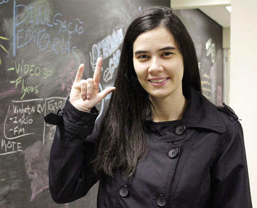 Na foto: Yoana Stefany Kovelis, deficiente auditiva, formada no curso de pedagogia da UPM, faz gesto em LIBRAS que simboliza "eu te amo".