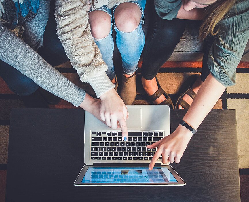 braços de diferentes pessoas visto de cima, apontando para um computador