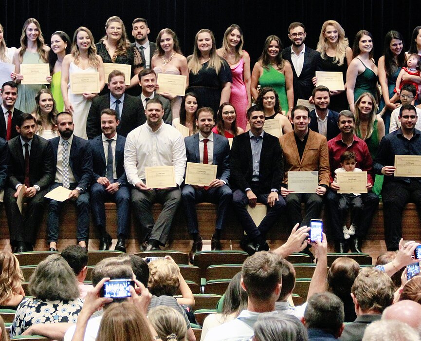 Uma noite de alegria e celebração. Assim foi a formatura do programa de residência médica e especialização do Hospital Universitário Evangélico Mackenzie (HUEM), realizada no sábado, 25 de fevereiro. A cerimônia aconteceu no auditório da Associação Médica do Paraná, que ficou lotado de amigos e familiares dos 94 residentes e especializandos da Faculdade Evangélica Mackenzie do Paraná (FEMPAR).