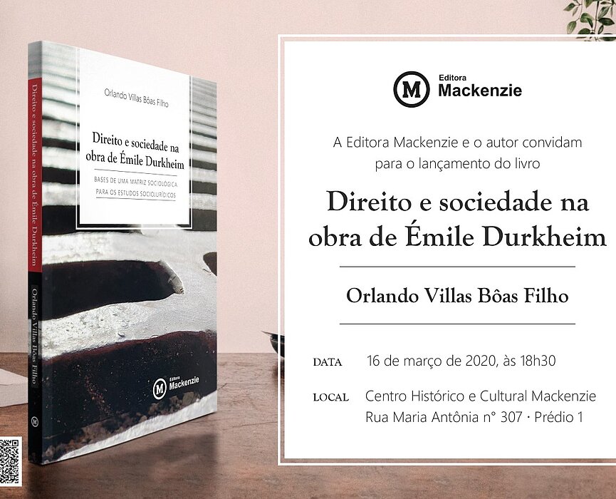 No dia 16 de março, às 18h30, a Editora Mackenzie faz o lançamento do livro Direito e sociedade na obra de Émile Durkheim: bases de uma matriz sociológica para os estudos sociojurídicos, do professor de Direito da Universidade Presbiteriana Mackenzie (UPM), Orlando Villas Bôas Filho. O evento acontece no Centro Histórico e Cultural Mackenzie, campus Higienópolis.