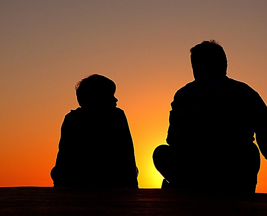 silhueta de pai e filho sentados contra um por do sol