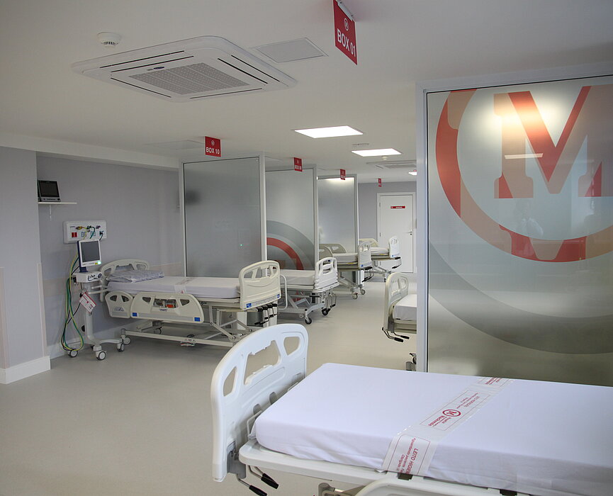 A nova Unidade de Queimados foi idealizada com o adequado espaçamento entre os leitos, estruturas de apoio, como depósito de material de limpeza no tamanho apropriado, área de enfermagem e área de prescrição médica de acordo com as especificações exigidas pelas normas vigentes da vigilância sanitária.