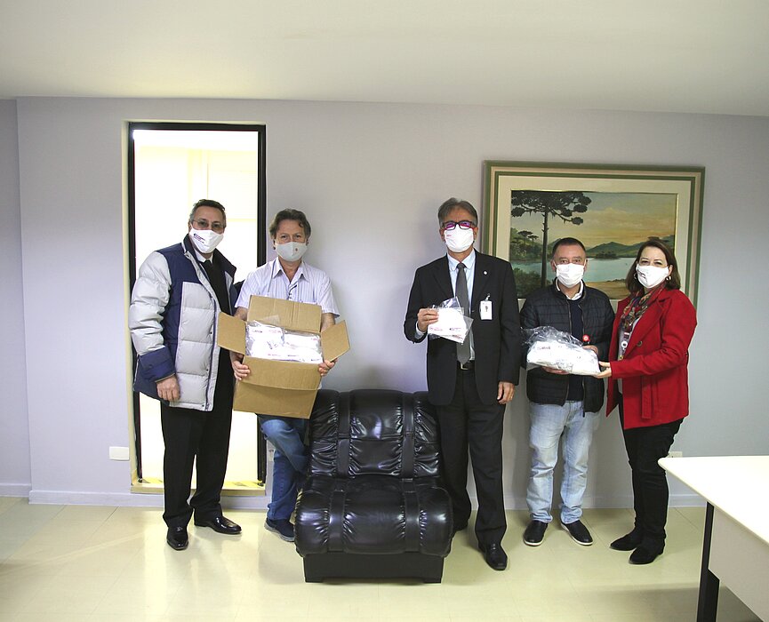 Também foi executada a doação de 2 mil toucas personalizadas para uso dos recém-nascidos e máscaras personalizadas para a proteção dos profissionais em relação ao contágio da Covid-19.