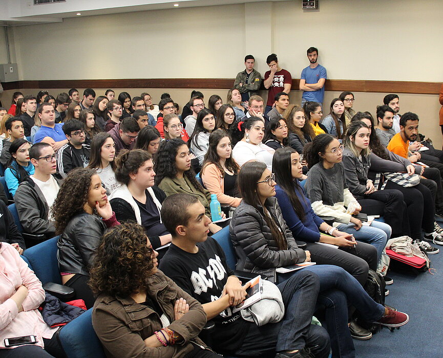 “É uma alegria falar sobre a carreira de delegado durante a Semana do Advogado aqui do Mackenzie. Também sou mackenzista e uma felicidade e nostalgia imensas me acometeram ao entrar aqui novamente”, comenta Raquel, que é formada em Direito pela FDir da UPM.