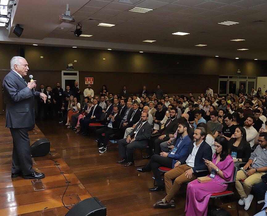 Para Temer, a constituição conseguiu ser longeva porque uniu questões dos direitos sociais com princípios liberais, e alertou os jovens da Universidade que assistiam ao evento.