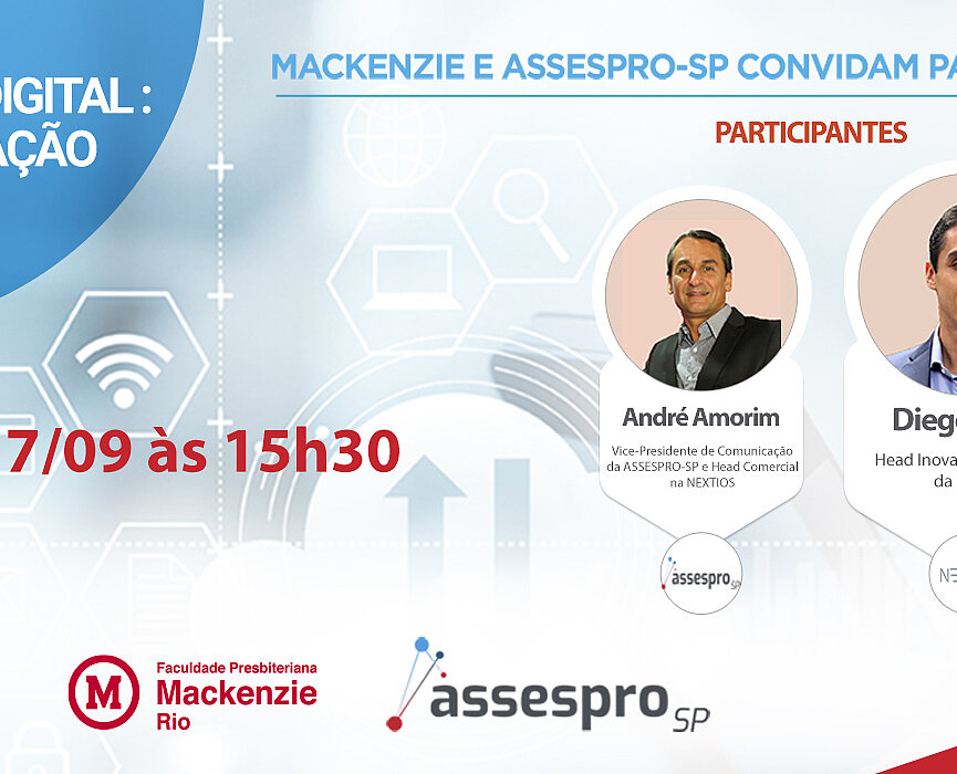 Entre os tópicos que serão discutidos nesta quinta-feira estão: tecnologia, inovação, transformação digital, decisão baseada em dados e mudança de mindset. A palestra contará com a presença do Head de Inovação e Tecnologia na NEXTIOS, Diego Santos; do Vice-Presidente de Comunicação da ASSESPRO-SP e Head Comercial na NEXTIOS, André Amorim; e do Coordenador Geral da Pós-Graduação Mackenzie Rio, professor Fernando de Oliveira Santoro.