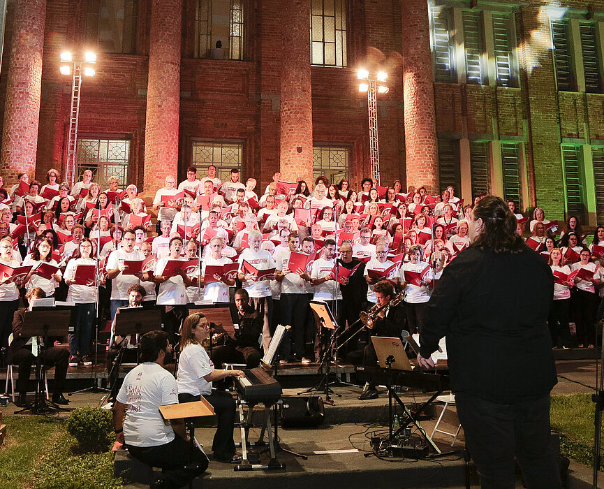 Grupos de amigos, famílias com crianças no colo ou de mãos dadas com seus pais olhavam atentos para os coralistas que tomavam seus lugares, preenchendo os degraus do lindo seminário de tijolos vermelhos, decorado com luzes coloridas. O silêncio se quebrou quando o coro com mais de 300 vozes, entre jovens, adultos e crianças, se elevou para celebrar a data mais bela do ano: o Natal.
