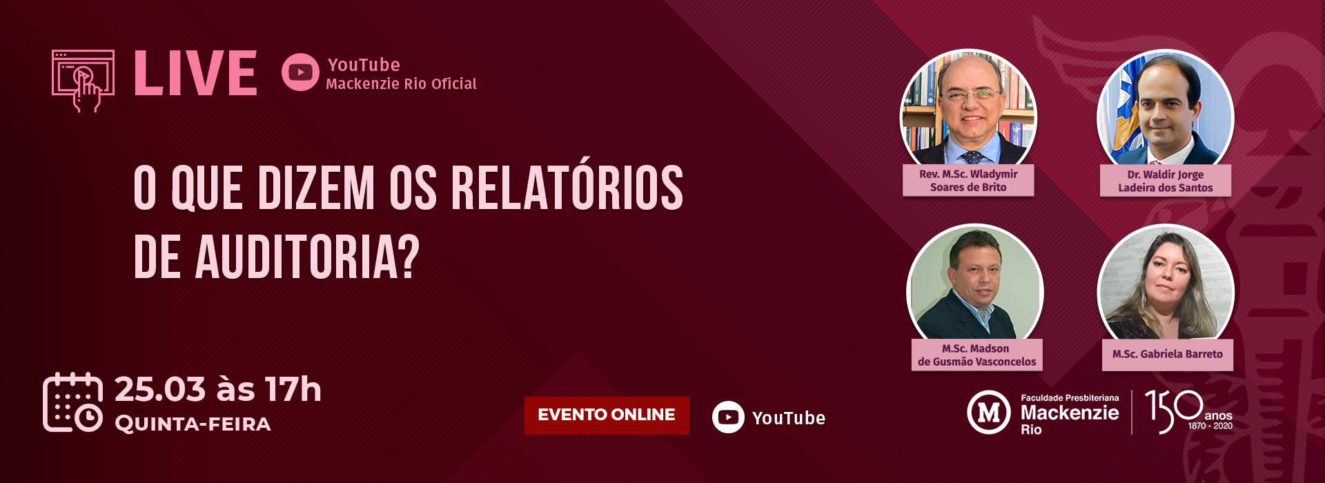 A Faculdade Presbiteriana Mackenzie Rio promoverá uma live no Canal do Youtube, quinta-feira, dia 25.03 às 17h, sobre o tema "O que dizem os Relatórios de Auditoria?" A conversa contará com as participações: - Rev. M.Sc. Wladymir Brito, Diretor Geral da FPM RIO - Dr. Waldir Ladeira, Coordenador do curso de Ciências Contábeis da FPM RIO. - M.Sc. Madson de Gusmão Vasconcelos, Mestre em Ciências Contábeis pela UERJ, Especializado em Administração Financeira pela FGV, Professor do curso de Ciências Contábeis da FPM RIO e Gerente de normas de Auditoria. -  M.Sc. Gabriela Barreto, Professora do curso de Ciências Contábeis da Mackenzie Rio Os alunos dos cursos de graduação que participarem, terão direito a horas complementares. Cada live assistida vale 10 horas de atividade complementar. As horas complementares só serão atribuídas aos alunos que encaminharem um relatório sobre o conteúdo abordado direto via TIA. Na hora de anexar o relatório no TIA, é muito importante que selecione opção "Palestra Profissional", para que as 10 Horas Complementares sejam contabilizadas corretamente. Marque na sua agenda e venha participar dessa Live você também! O evento será 100% online e GRATUITO. 25.03 às 17h, no Canal do Youtube: Mackenzie Rio Oficial.   Não perca!