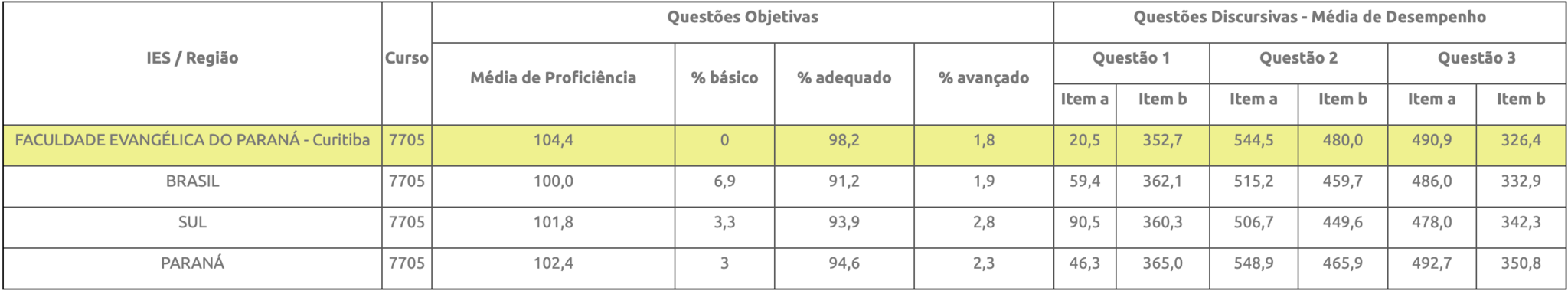 No primeiro exame realizado a Faculdade Evangélica do Paraná – FEPAR obteve a melhor classificação como IES / região.