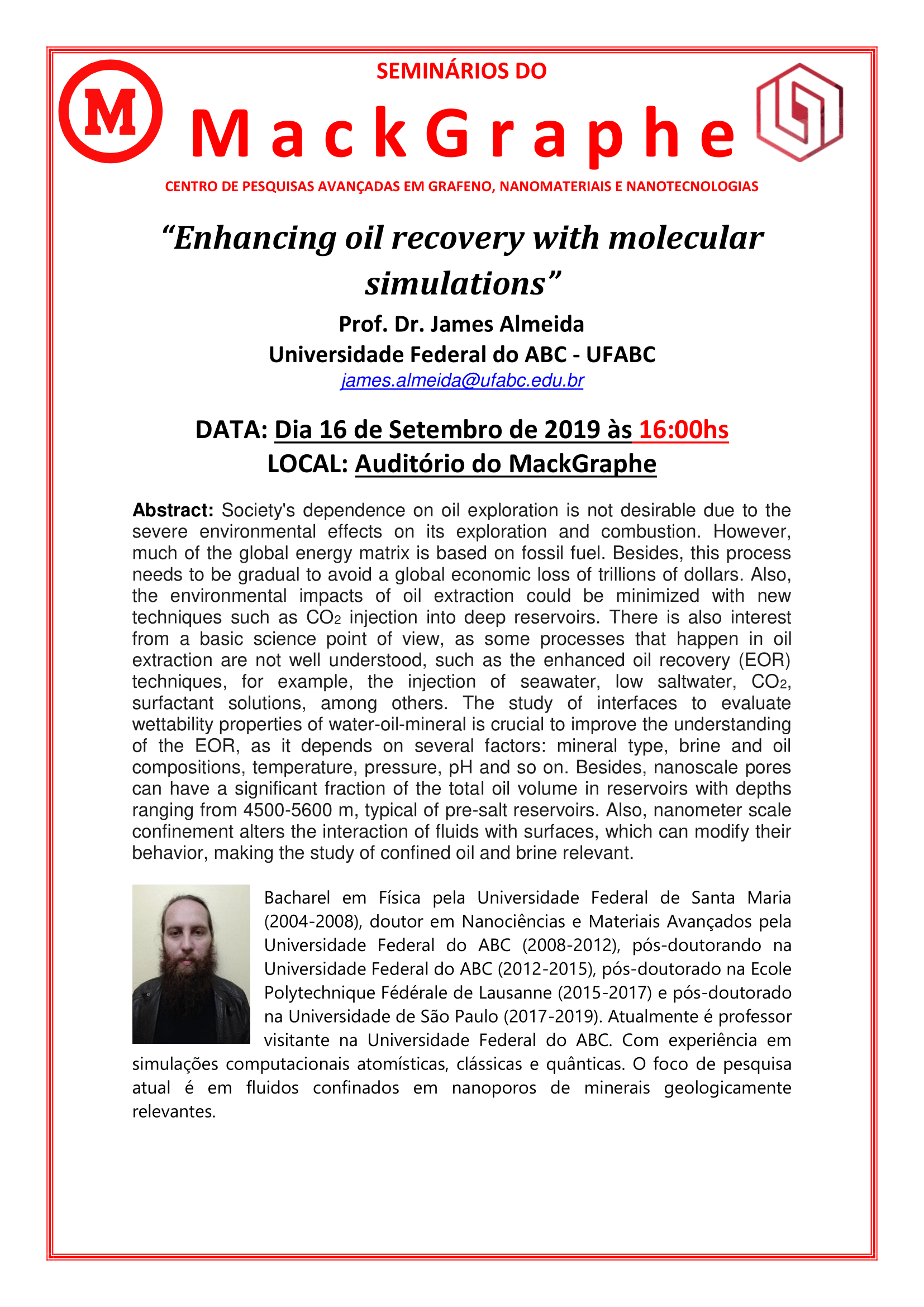16/09/2019 - Prof. Dr. James Almeida - "Enhancing Oil Recovery with Molecular Simulations"