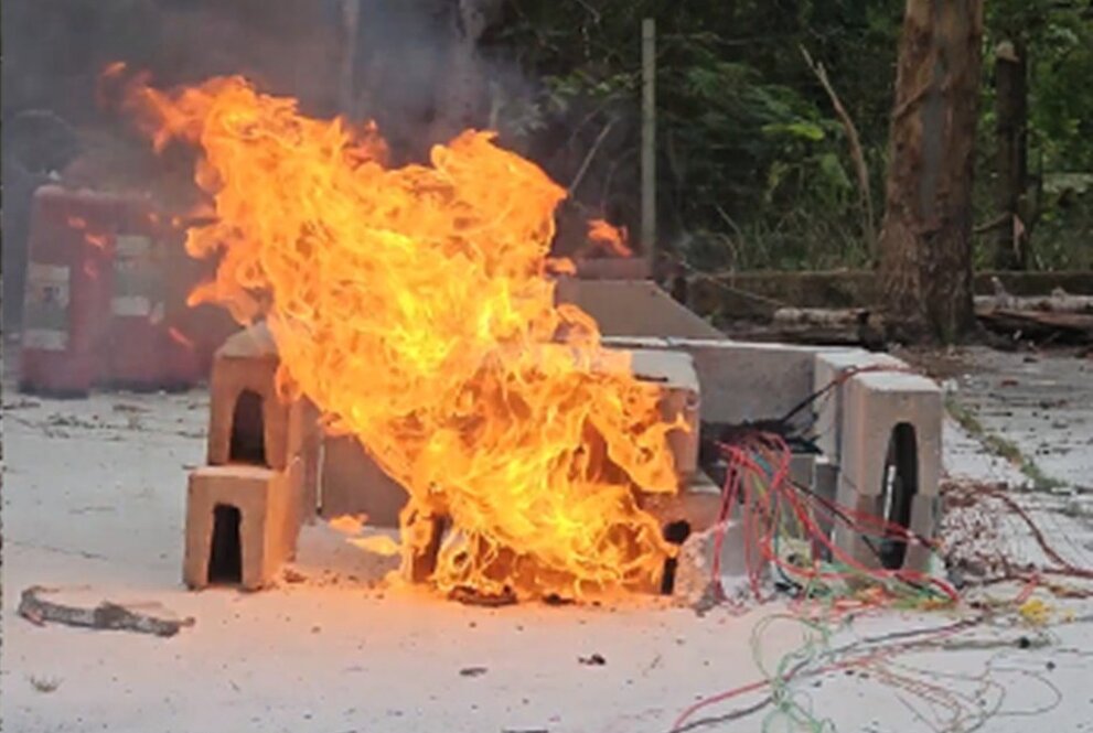A última etapa foi a simulação de um incêndio real próximo ao BESS, com a participação de bombeiros, responsáveis por conter os focos do incêndio. Os métodos de combate com baterias de íons de lítio também foram documentados para análise e recomendações de boas práticas.