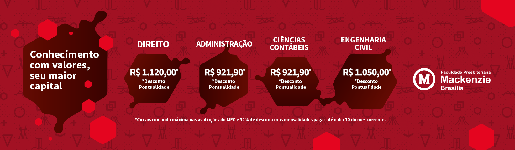 Inscreva-se Matrícula Acompanhe sua inscrição Confira os Cursos Compartilhe nas Redes Sociais Faculdade Presbiteriana Mackenzie Brasília Últimas Informações No news available. Vestibular Agendado - Prova PresencialENEM2ª GraduaçãoTransferênciaPassaporteVestibular Agendado - Prova Presencial2026.1 Edital Aditivo Inscrições Abertas. ENEM2026.1 Edital Aditivo Inscrições Abertas.2º GRADUAÇÃO2026.1 Edital Aditivo Inscrições Abertas.TRANSFERÊNCIA2026.1 Edital Aditivo Inscrições Abertas.Passaporte2026.1 Edital Aditivo Inscrições Abertas. Conheça os Cursos de Graduação - Faculdade de Brasília | Faculdade BrasíliaInscrições AbertasEscola de Gestão e Negócios Públicos: Administração Bacharelado | Faculdade BrasíliaInscrições AbertasEscola de Gestão e Negócios Públicos: Ciências Contábeis Bacharelado | Faculdade BrasíliaInscrições AbertasDireito Bacharelado | Faculdade BrasíliaAvise-meEngenharia Civil Bacharelado