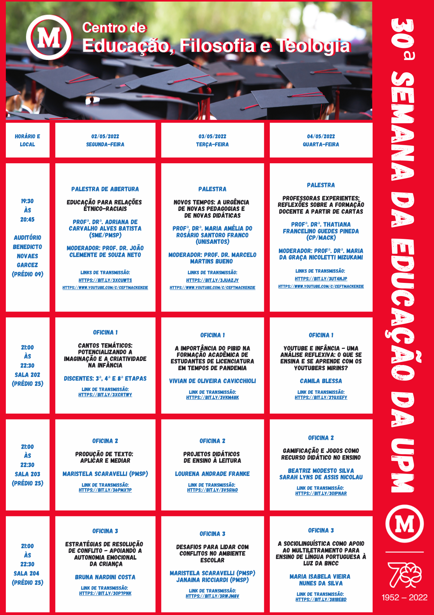 Cabe destacar que, neste ano de 2022, estamos comemorando 50 anos do Curso de Pedagogia! Desde seu reconhecimento, em outubro de 1972, temos procurado cumprir o legado de todos que aqui passaram, a saber: a busca permanente da excelência na formação de professores, mantendo a memória dos fundadores da Universidade Presbiteriana Mackenzie - UPM e cumprindo seu importante papel social, pois, pensar em nosso Brasil, que neste ano comemora seus 200 anos de independência, traz a certeza de um longo caminho ainda a percorrer no alcance de uma educação de qualidade acessível a todos.
