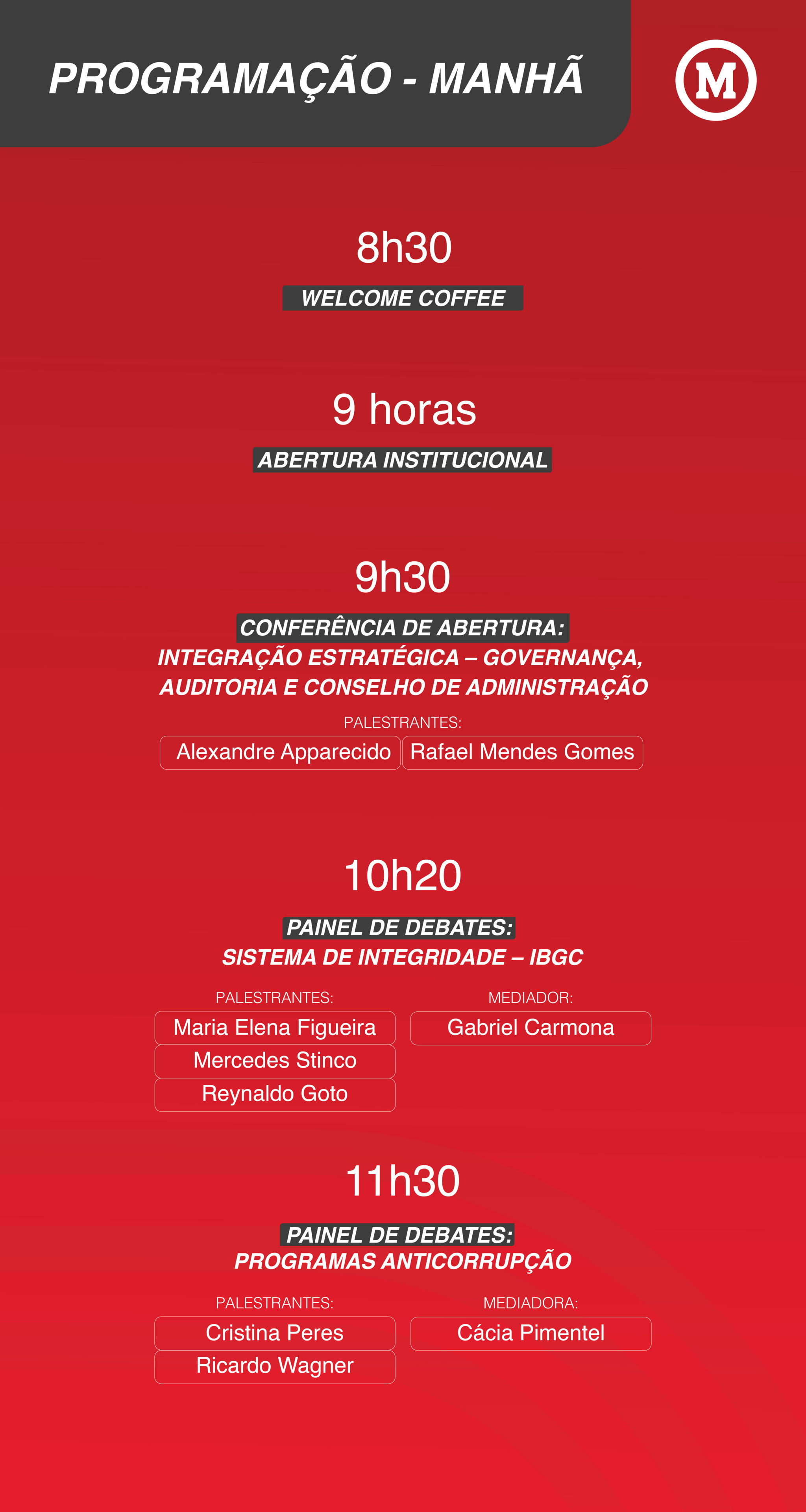 Mais de 15 executivos com experiência em conselhos, auditoria, riscos e compliance participarão dos painéis. Haverá representantes de empresas públicas e privadas com atuação global. Daniel Dias, multicampeão paralímpico, falará sobre integridade e ética em sua carreira.