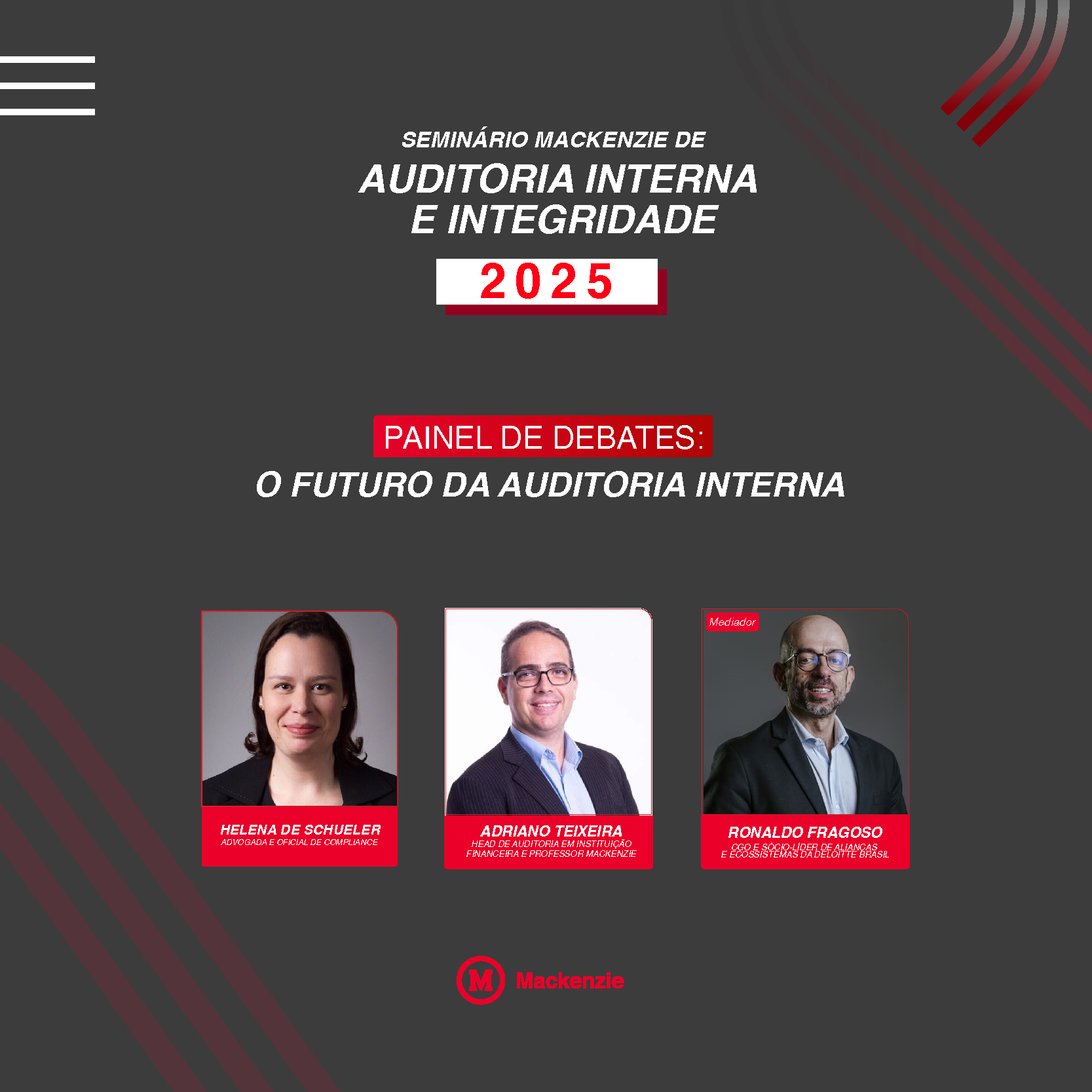 Participe de um Seminário único que conecta o ambiente acadêmico ao mundo corporativo, promovendo uma troca rica entre profissionais de auditoria interna, compliance, gestão de riscos e conselheiros. Serão debatidas as expectativas da Alta Administração e exploradas como as áreas podem atuar de forma integrada e estratégica para fortalecer a integridade, a ética e o combate à corrupção nas organizações.
