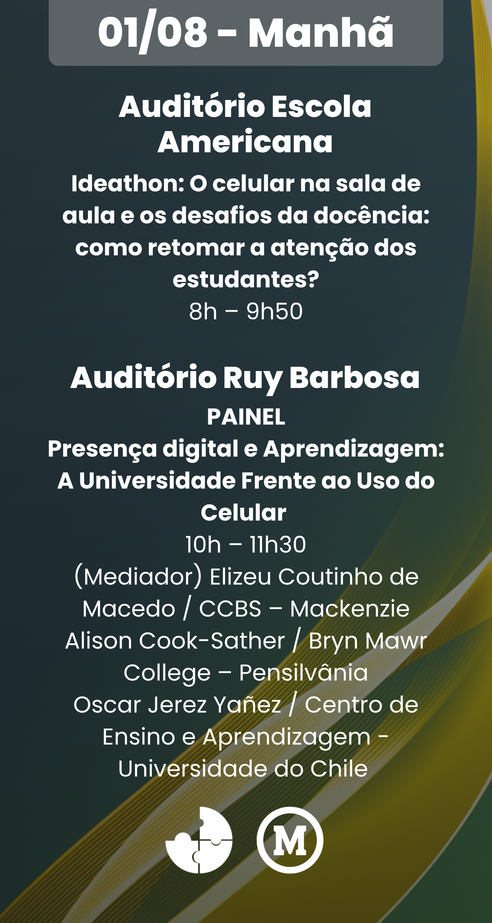 Por fim, o Ideathon convidará os docentes a proporem, em grupos, alternativas para lidar em sala de aula com o uso excessivo dos celulares. Acompanhem, a seguir, a programação completa do evento.