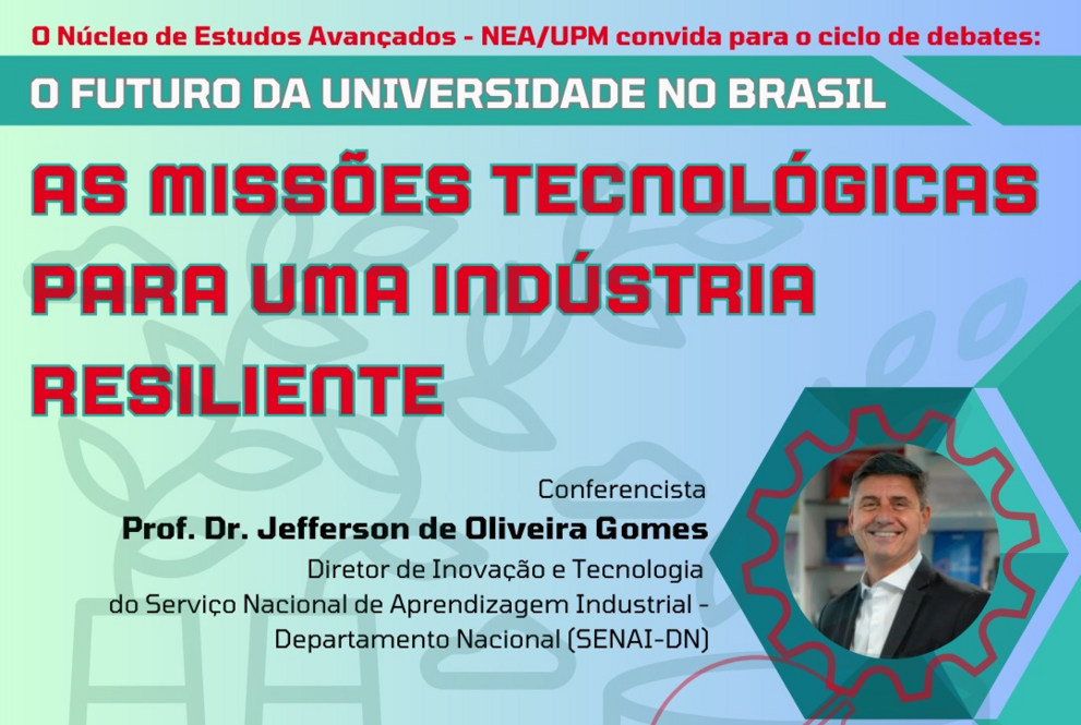 A palestra As Missões Tecnológicas para uma Indústria Resiliente será ministrada pelo diretor de Inovação e Tecnologia do Serviço Nacional de Aprendizagem Industrial - Departamento Nacional (SENAI-DN) - e professor do Instituto Tecnológico de Aeronáutica (ITA), Jefferson Gomes. A medição será feita pelo professor do NEA, Antônio Augusto Couto.