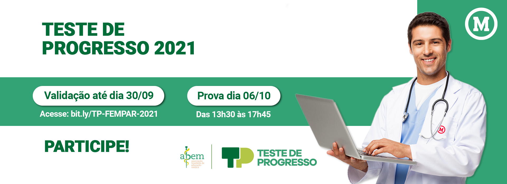 O TP é anualmente aplicado aos estudantes regularmente matriculados no curso de graduação em Medicina (do primeiro ano até o sexto ano). Todos os alunos do 1º ao 6º ano foram pré-inscritos para realizar o Teste de Progresso 2021, entretanto todos devem confirmar a inscrição até dia 30/09/2021 clicando aqui. Lembrando que os acadêmicos que não realizarem a validação de sua inscrição, não poderão fazer a prova!