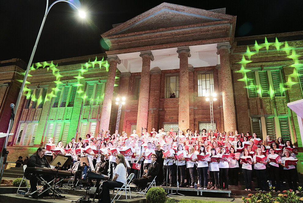 Grupos de amigos, famílias com crianças no colo ou de mãos dadas com seus pais olhavam atentos para os coralistas que tomavam seus lugares, preenchendo os degraus do lindo seminário de tijolos vermelhos, decorado com luzes coloridas. O silêncio se quebrou quando o coro com mais de 300 vozes, entre jovens, adultos e crianças, se elevou para celebrar a data mais bela do ano: o Natal.