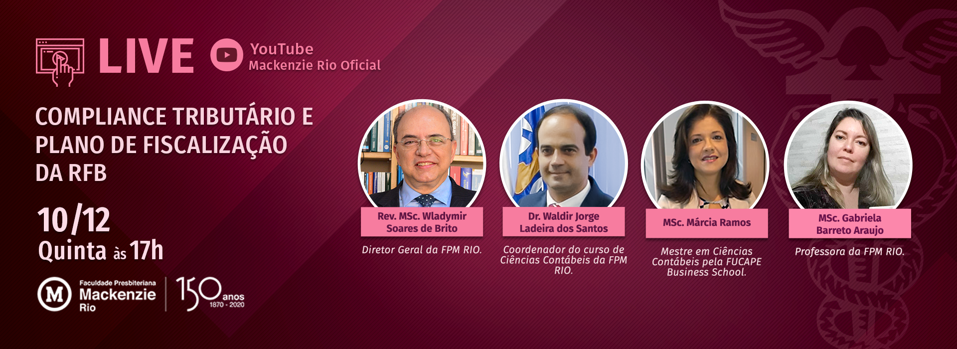A Faculdade Presbiteriana Mackenzie Rio promoverá uma live no Canal do Youtube, quinta-feira, dia 10/12, às 17h, sobre o tema "Compliance Tributário e Plano de Fiscalização da RFB."