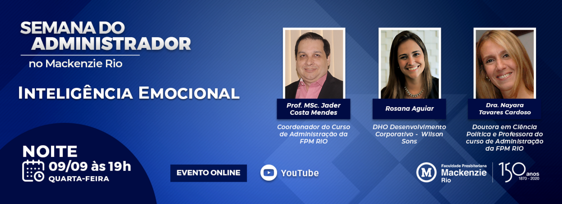 A Faculdade Presbiteriana Mackenzie Rio irá promover no Canal do Youtube, quarta-feira, dia 09/09, às 19h, uma Live sobre o tema "Inteligência Emocional."