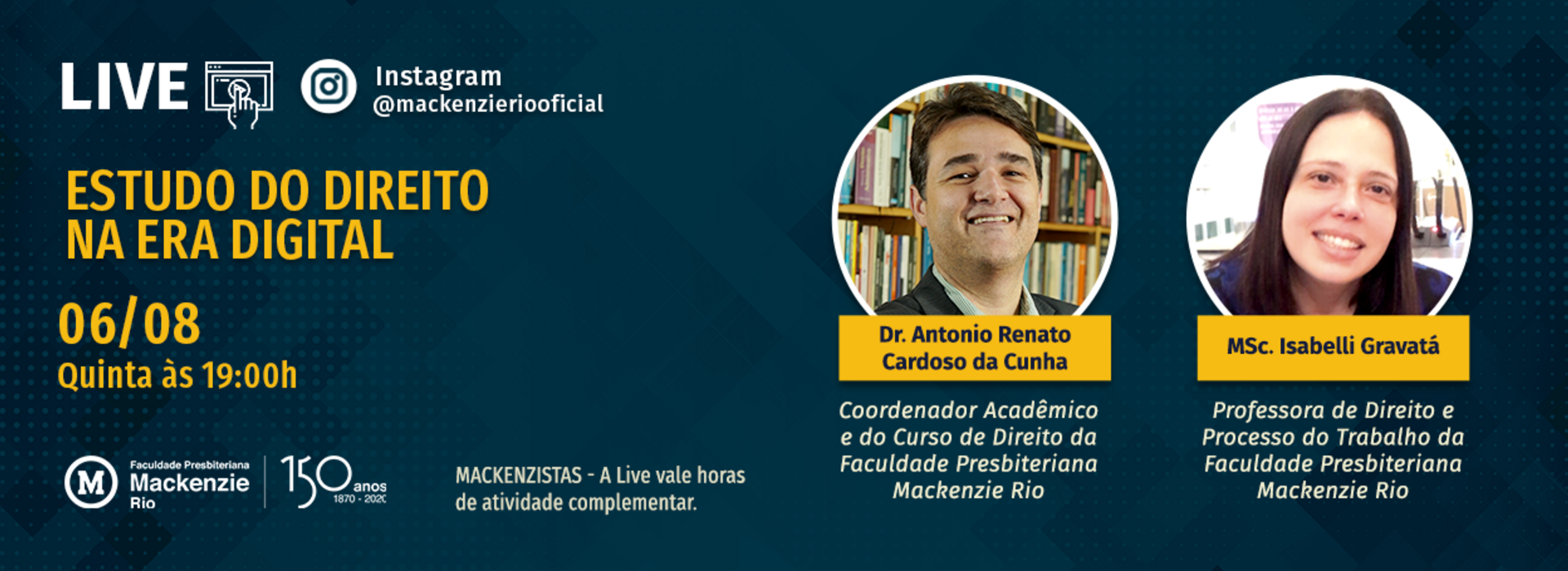 A Faculdade Presbiteriana Mackenzie Rio irá promover no seu perfil do Instagram, quinta-feira, dia 06/08, às 19h, uma Live sobre o tema "O Estudo do Direito na Era Digital".