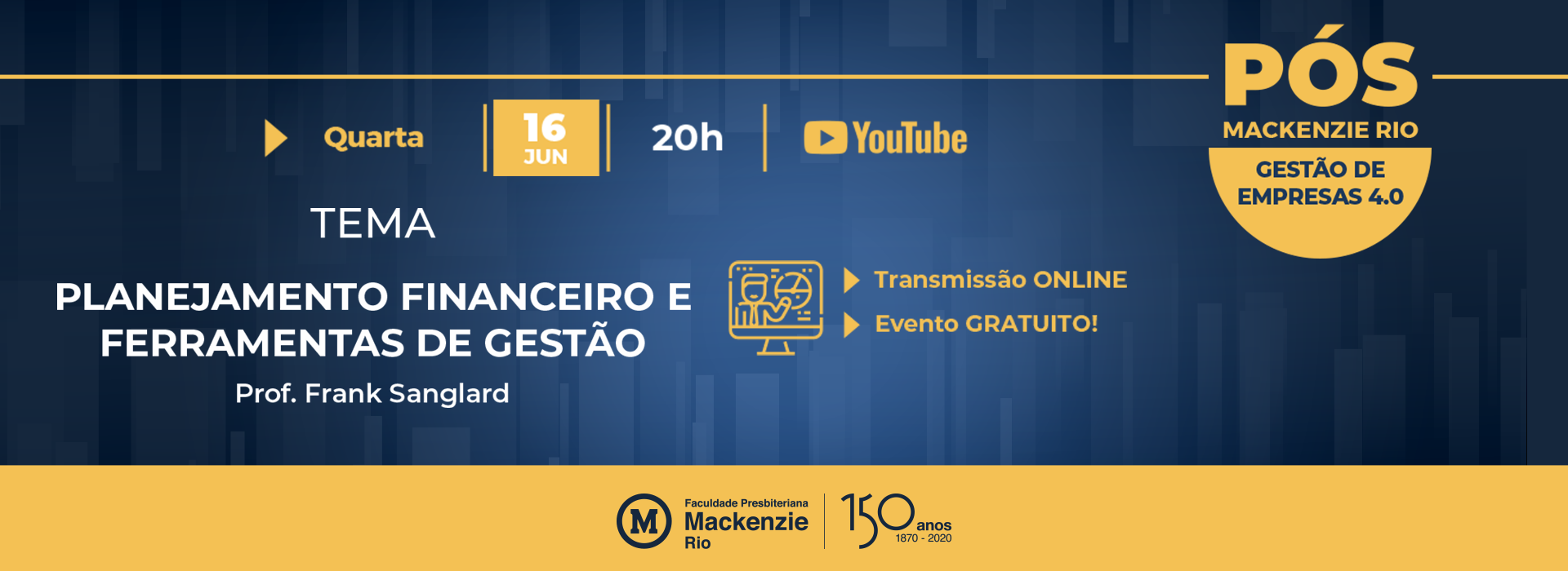 No dia 16/06, às 20h, o Prof. Frank Sanglard, da Pós-graduação em Gestão de Empresas 4.0, falará sobre: “Planejamento Financeiro e Ferramentas de Gestão.”, através de uma transmissão ao vivo pelo YouTube do Mackenzie Rio.