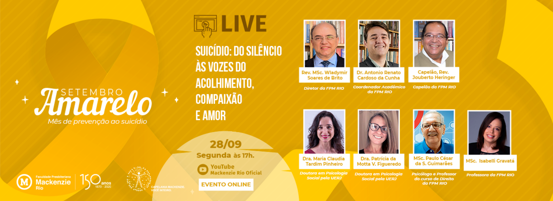 A Faculdade Presbiteriana Mackenzie Rio promoverá uma live no Canal do Youtube, segunda-feira, dia 28/09, às 17h, sobre o tema "Suicídio: do silêncio às vozes do acolhimento, compaixão e amor."