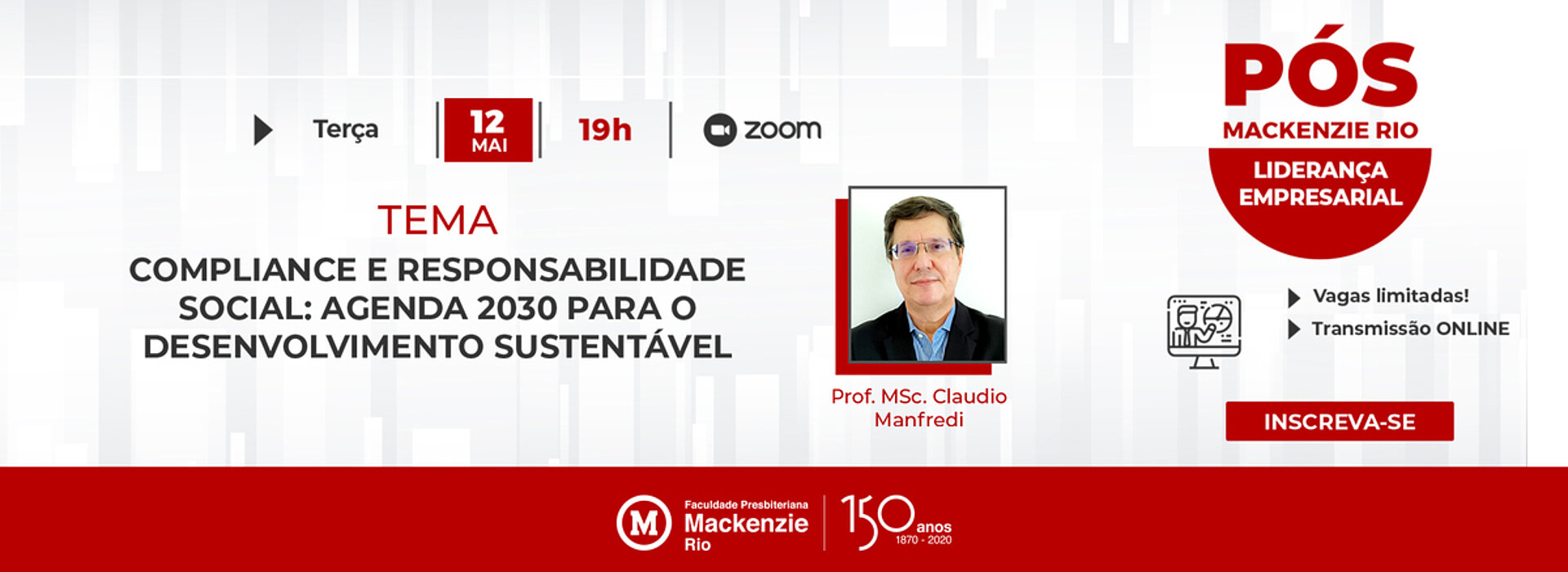 No dia 12/05, às 19h, o Prof.° Claudio Manfredi, professor da Pós-graduação em Liderança Empresarial, falará sobre: “Compliance e Responsabilidade Social: Agenda 2030 para o Desenvolvimento Sustentável”, através de uma transmissão ao vivo pelo zoom.