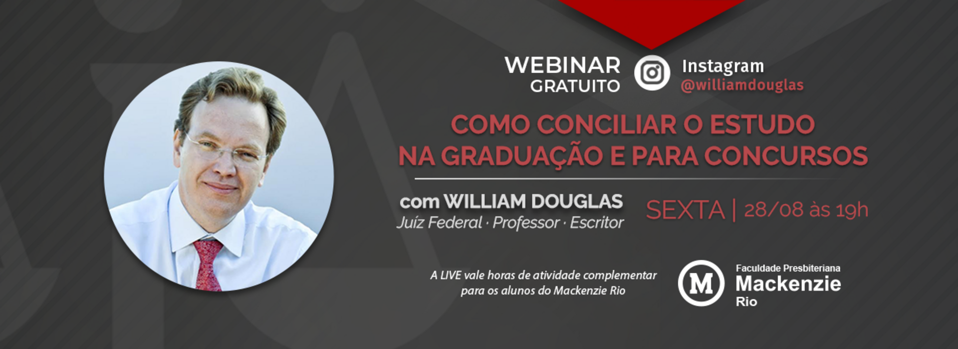 Você está convidado para participar da palestra nacional para acadêmicos de Direito, que será promovida pelo Professor William Douglas no perfil do Instagram @williamdouglas, sexta-feira, dia 28/08, às 19h. A Live terá o tema: “Como conciliar o estudo na graduação e para concursos”.