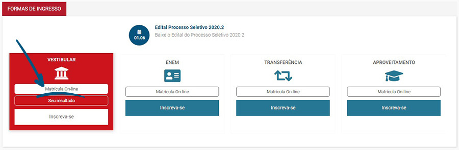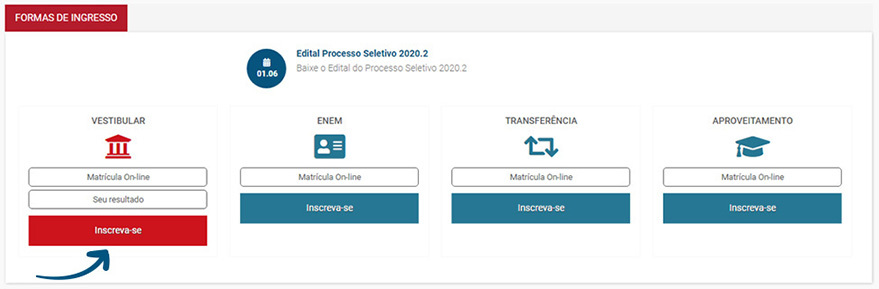 2º PASSO: Na Home, clique sobre o botão “Vestibular” para acessar a aba de inscrição.