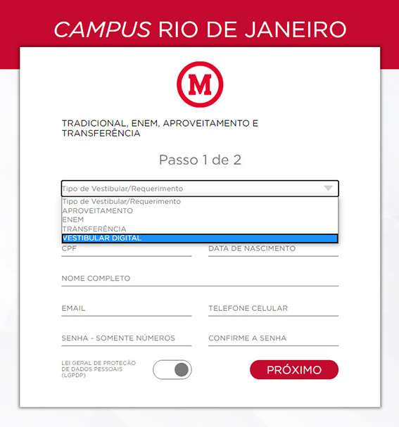 4º PASSO: Um formulário de inscrição será aberto. Escolha sua forma de ingresso, neste caso, “Vestibular Digital”