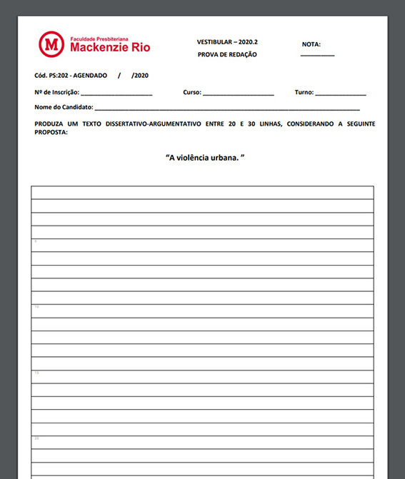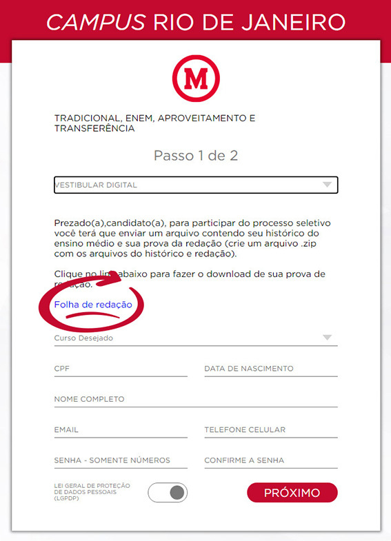 Basta clicar sobre “Folha de Redação” e fazer o download. Antes de prosseguir, faça sua redação e uma vez que concluir, escaneie junto com seu histórico escolar em um documento ÚNICO de PDF.