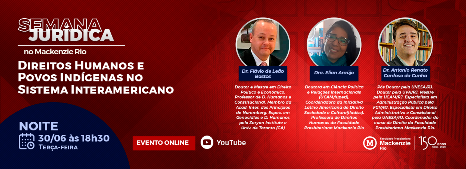 A Faculdade Presbiteriana Mackenzie Rio irá promover no Canal do Youtube, terça feira, dia 30/06, às 18h30, uma Live sobre o tema "Direitos Humanos e Povos Indígenas no Sistema Interamericano".