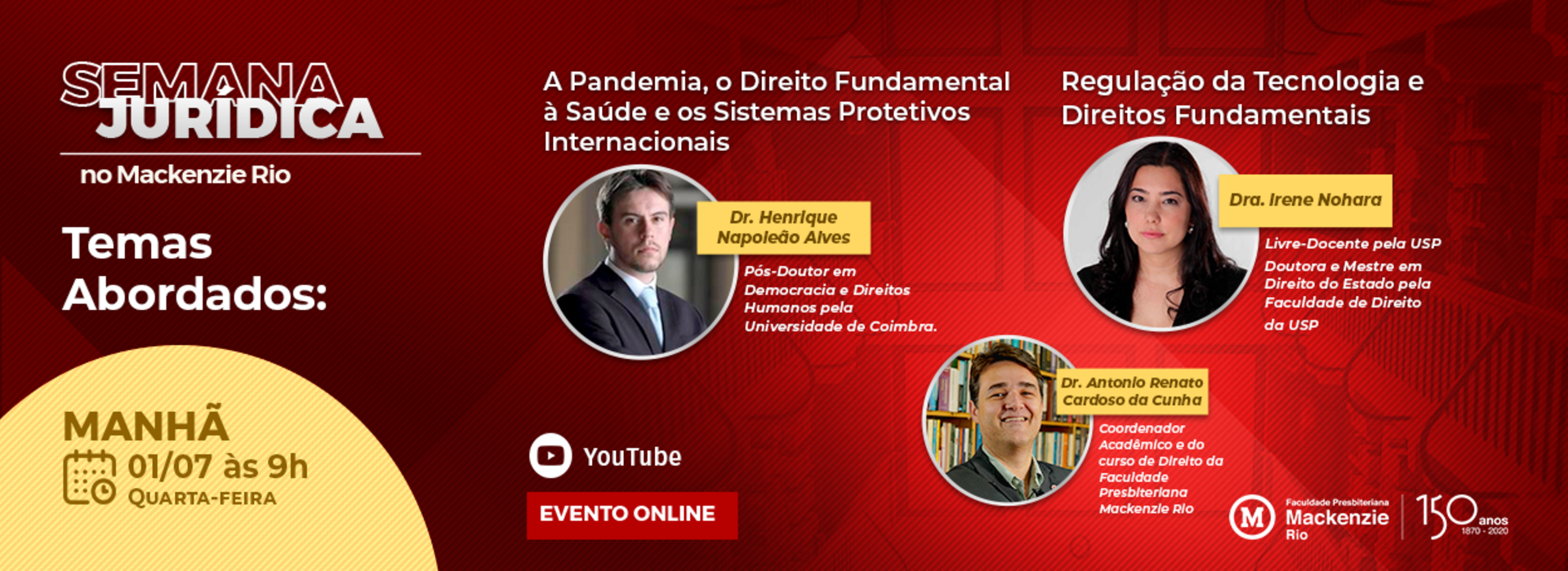 A Faculdade Presbiteriana Mackenzie Rio irá promover no Canal do Youtube, quarta feira, dia 01/07, às 9h, uma Live sobre o tema "A Pandemia, o Direito Fundamental à Saúde e os Sistemas Protetivos Internacionais".