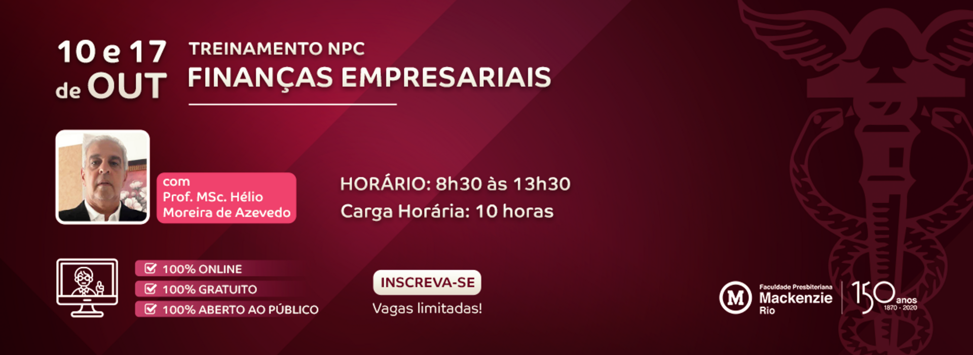 Nos dias 10 e 17 de Outubro, a Faculdade Presbiteriana Mackenzie Rio irá oferecer de forma on-line, gratuita e aberta ao público, um treinamento de Finanças Empresariais.