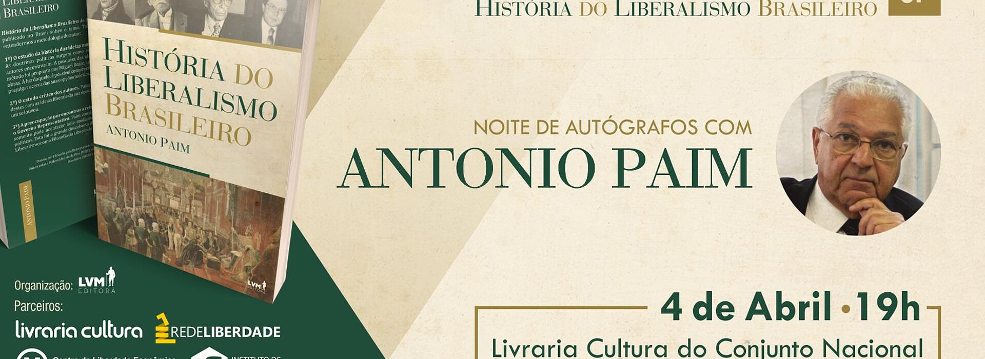 A LVM Editora em parceria com o Centro Mackenzie de Liberdade Econômica, a Livraria Cultura, o Instituto de Formação de Líderes - IFL, o Centro Interdisciplinar de Ética e Economia Personalista (CIEEP), o Instituto Mises Brasil e a Rede Liberdade temos a honra de convidar você a uma noite de autógrafos com Antonio Paim, lançando seu livro - História do Liberalismo Brasileiro.