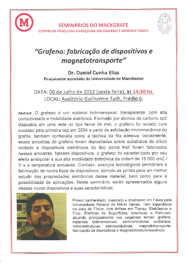 06/07/2012 - Dr. Daniel Elias - Grafeno: fabricação de dispositivos e magnetotransporte