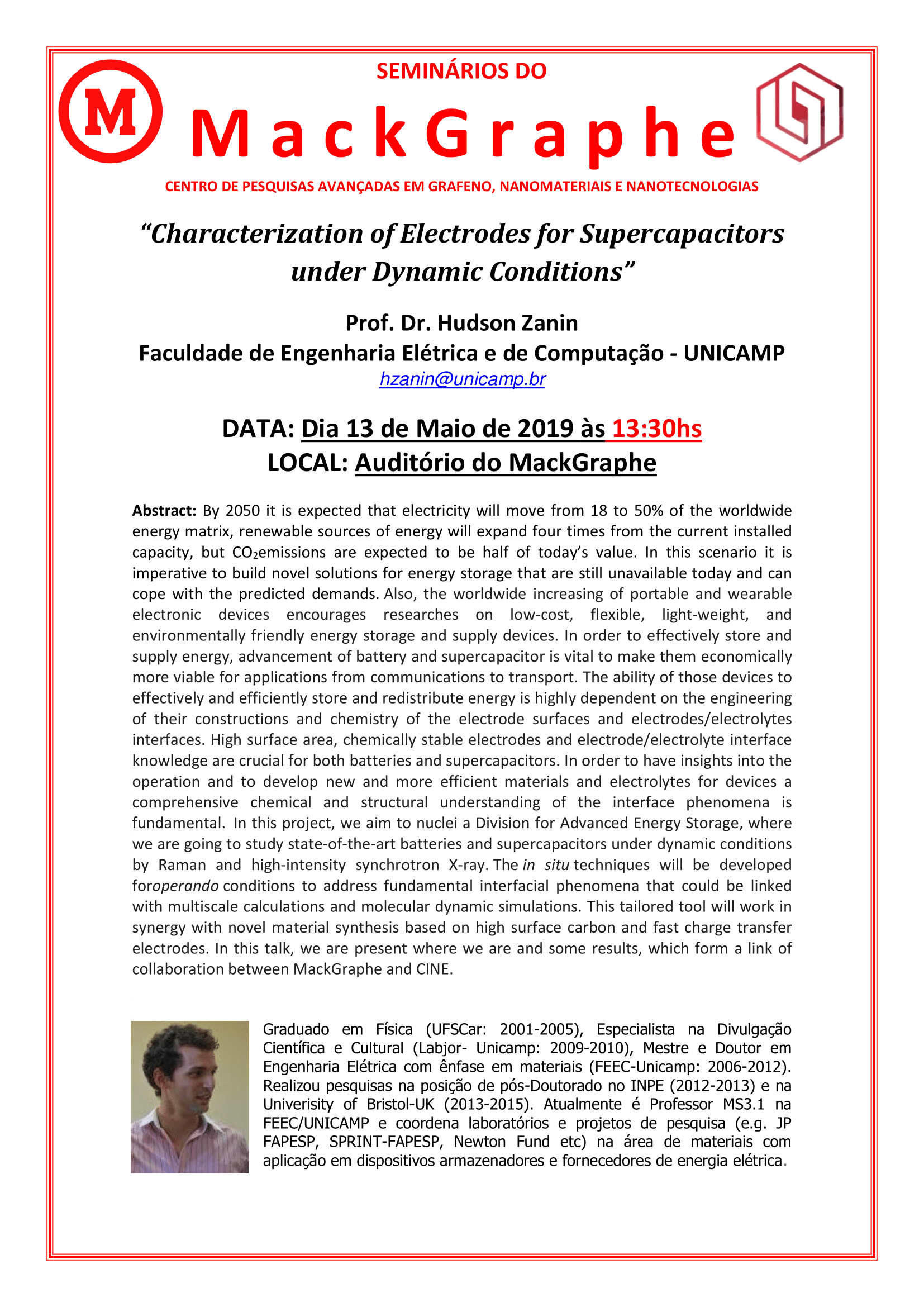 13/05/2019 - Prof. Dr. Hudson Zanin - "Characterization of Electrodes for Supercapacitors under Dynamic Conditions"