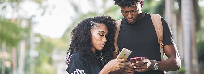 Na imagem, duas pessoas conferem um celular. Ao fundo, pode-se ver árvores e parte do céu