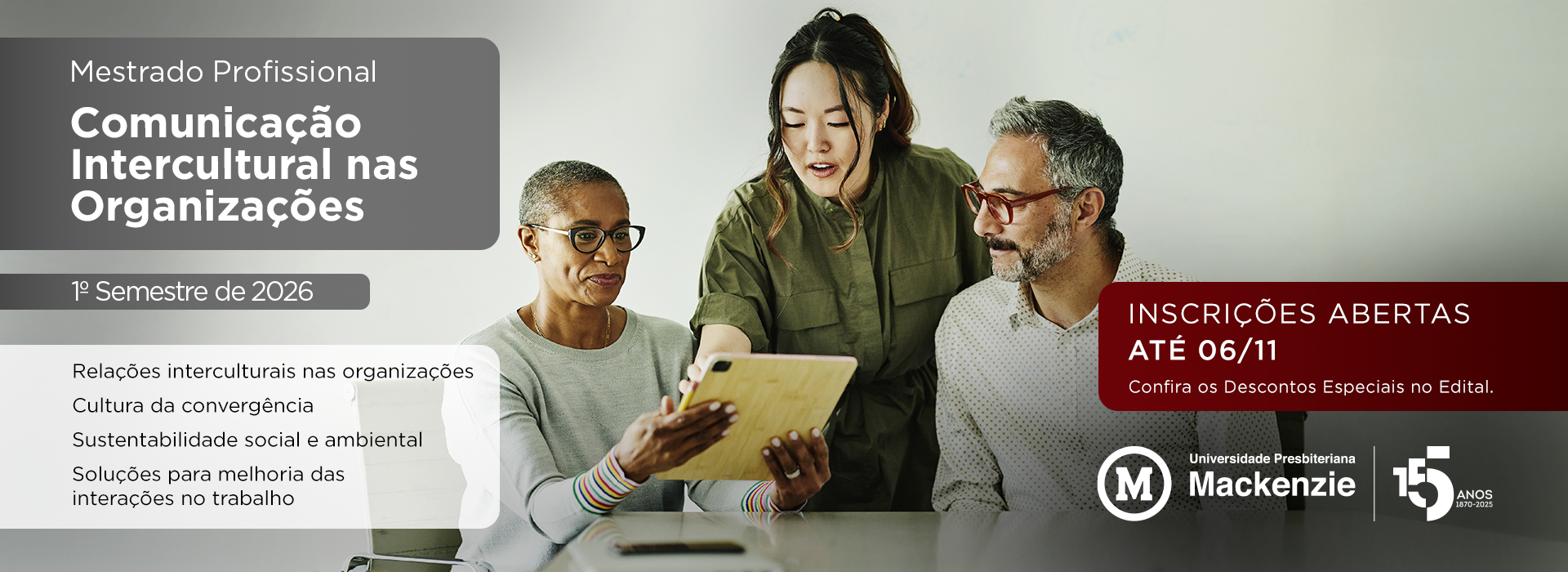 O processo seletivo para o Mestrado Profissional em Comunicação Intercultural nas Organizações está com inscrições abertas. Os interessados podem conferir todas as informações e o edital completo aqui.