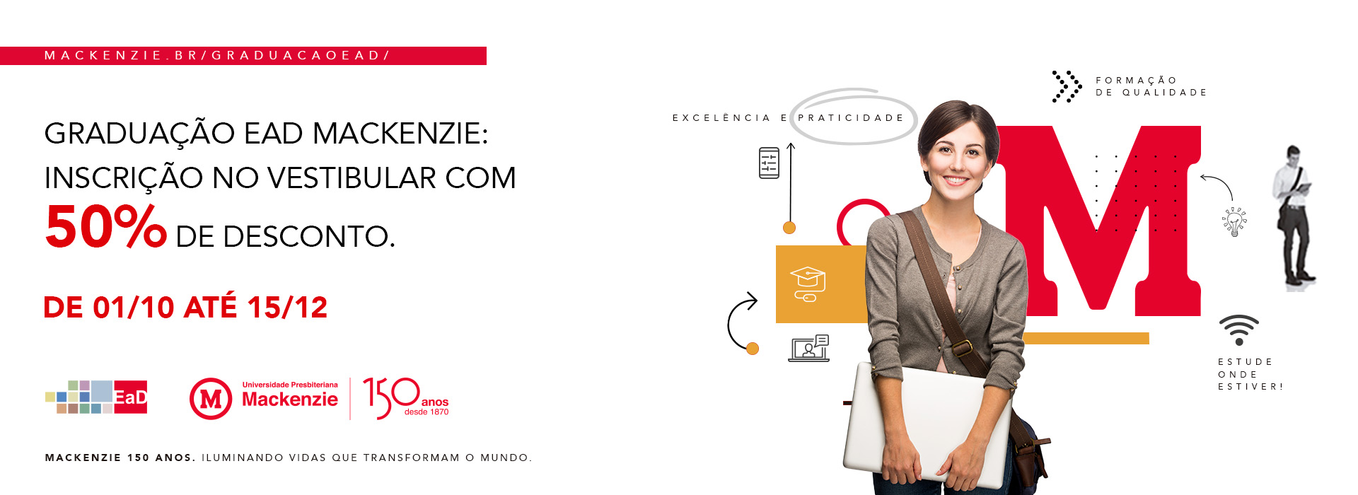 A Universidade Presbiteriana Mackenzie (UPM) está com desconto de 50% no valor da inscrição do Vestibular de Graduação EaD até o dia 15 de dezembro. Para garantir o benefício e pagar R$25, inscreva-se aqui. A Graduação EaD da UPM carrega em si os anos de tradição e inovação da melhor Universidade não pública do estado de São Paulo.