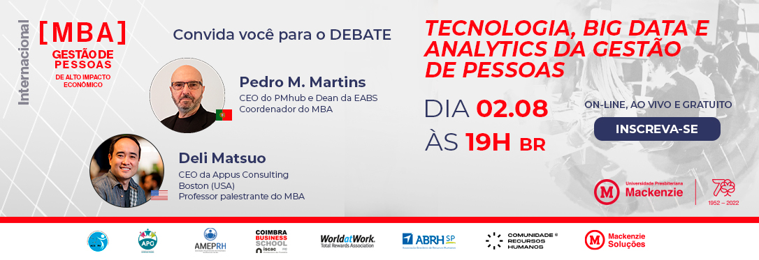 No dia 02 de agosto, às 19h, a Universidade Presbiteriana Mackenzie (UPM), campus Campinas, promoverá o webinar Tecnologia, Big Data e Analytics da Gestão de Pessoas, com foco em líderes e profissionais de RH que buscam uma qualificação contemporânea sobre o tema.