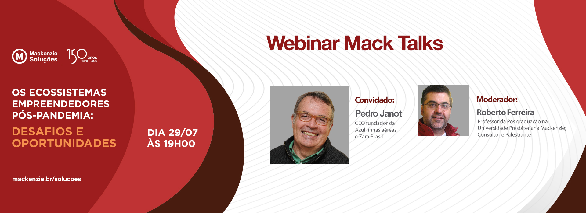 No dia 29 de julho, será realizada a sexta edição do Mack Talks, série de encontros virtuais promovidos pelo Mackenzie Soluções, do Instituto Presbiteriano Mackenzie (IPM),para debater cenários e tendências do mundo corporativo. Neste novo webinar, será discutido sobre Os Ecossistemas Empreendedores Pós-Pandemia – Desafios e Oportunidades, bem como quais as perspectivas e cenários para o mundo do empreendedorismo após a crise provocada pela covid-19, incluindo os impactos do período de isolamento social sobre a economia brasileira e os efeitos da digitalização do mercado de trabalho. O encontro acontecerá às 19h.