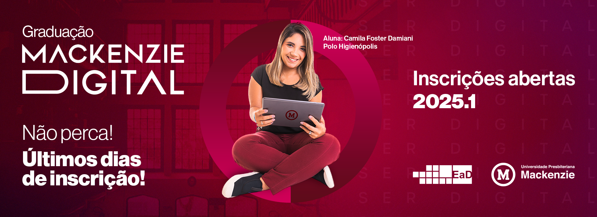 Essa modalidade de ensino representa uma oportunidade inovadora para a educação superior, alinhada à excelência acadêmica da Universidade Presbiteriana Mackenzie. Agora, ficou fácil estudar na melhor Instituição de Ensino Superior do estado de São Paulo e uma das melhores da América Latina. Clique aqui e faça a sua inscrição!