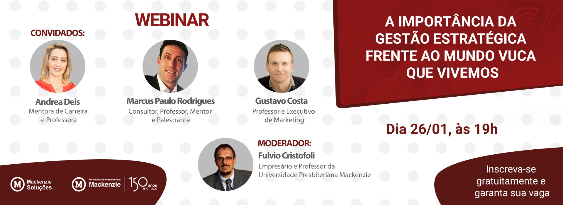No dia 26 de janeiro, às 19h, o Centro de Ciências Sociais e Aplicadas (CCSA) da Universidade Presbiteriana Mackenzie (UPM) realizará o webinar “A importância da Gestão Estratégica frente ao mundo VUCA que vivemos”. Para participar, os interessados devem se inscrever pelo link. O evento é gratuito.